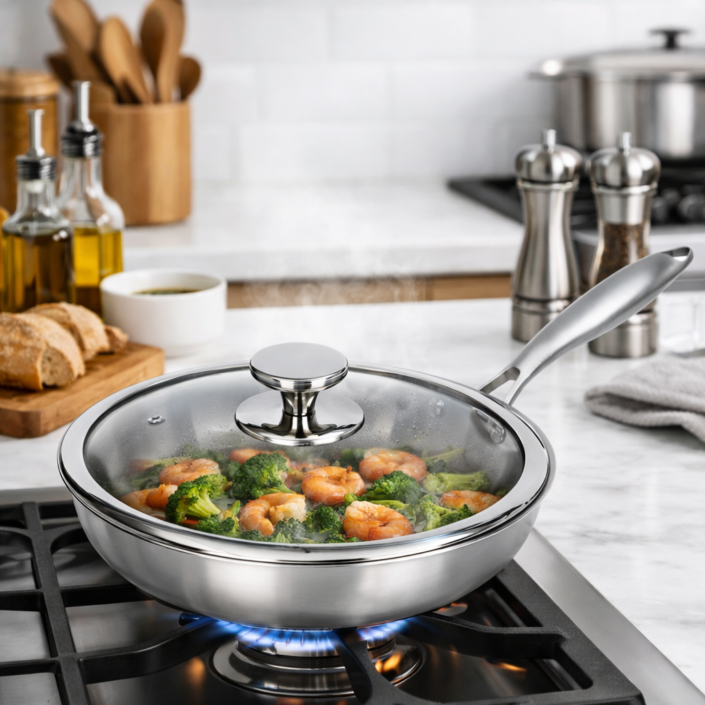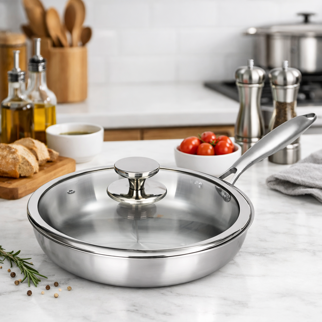 Poêle à frire de 3,5L antiadhésive en acier inoxydable à trois plis (tri-ply), conçue pour une cuisson homogène et performante. Sa base compatible induction assure une excellente diffusion de la chaleur, idéale pour la cuisson des steaks et plats saisis. Robuste et durable, elle est résistante aux rayures, facile à nettoyer et adaptée à un usage quotidien. Compatible tous feux, y compris induction.